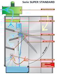 Кабины оснащены фильтрами тонкой очистки Paint-stop. Система Total Filter позволяет фильтровать до 100% воздуха благодаря полному устранению щелей между фильтрами и боковыми стенками кабины. Всасывание воздуха обеспечивает вытяжной вентилятор, установленный на крыше кабины. Циркуляция воды осуществляется при помощи погружного электронасоса из нержавеющей стали. Электрическая панель управления контролирует электродвигатели и систему освещения. Электрооборудование имеет сертификаты IMQ (Итальянского института по гарантии качества продукции) и СЕ.