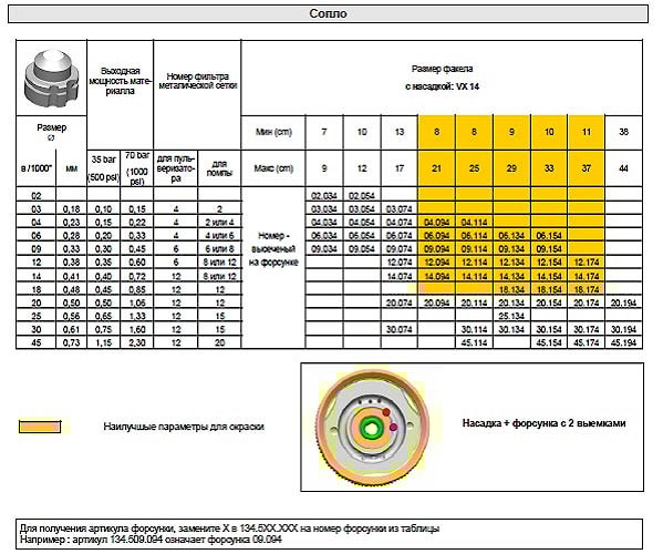 Таблица выбора форсунок для краскопультов KREMLIN AIRMIX. Ширина факела при распылении на расстоянии 25 см от окрашиваемой поверхности.